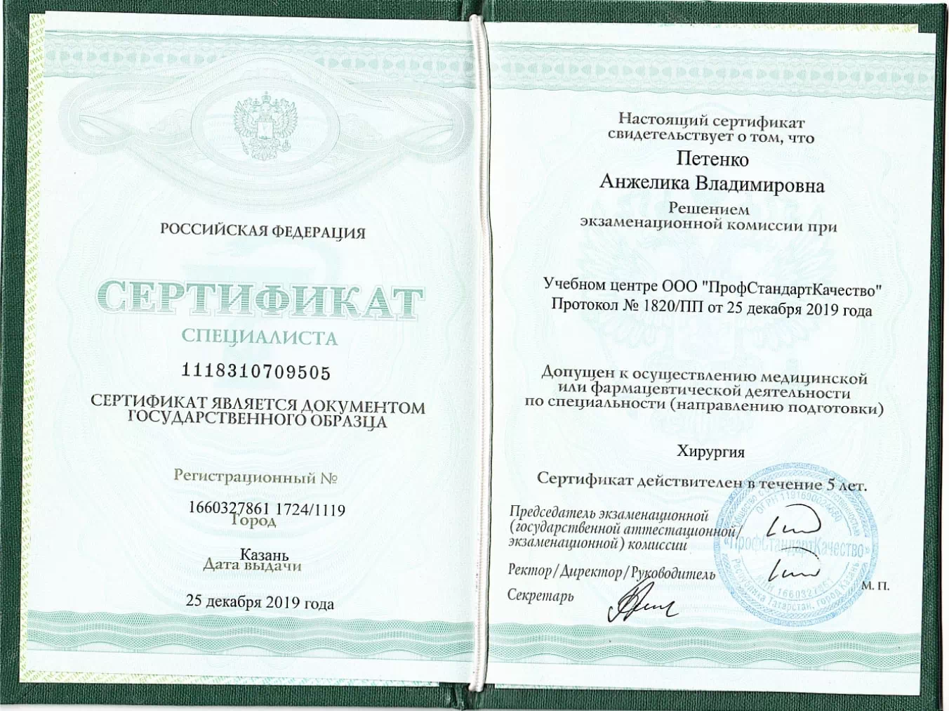- 2019 — ПрофСтандартКачество (квалификация: врач-хирург);